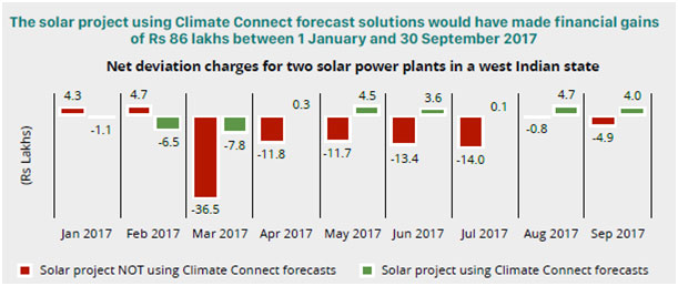 Two identical solar PV power projects (same installed capacity, same tariff, located adjacent to each other) operate in a West Indian state. The one using Climate Connect’s AI&ML based forecasting solution has earned a total of Rs 1.8 lakhs of additional revenue through the DSM for renewable energy projects. The other project, using a forecasting solution from a competitor, has paid a total of Rs 84.2 lakhs to the regulator under the same regulations between 1 January and 30 September 2017. (Source: SLDC).