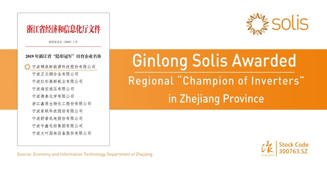 Ginlong Solis has been recognized as a “Hidden Champion” award winner by the regional Zhejiang Provincial Economic and Information Commission. To be named to the agency’s prestigious list of companies that are making an economic and social impact within the region, Ginlong had to undergo a thorough vetting process by multiple entities, including the economic and information departments from both the city and the province.