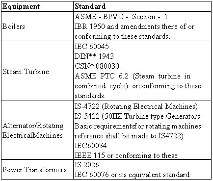 For biomass based cogeneration projects, equipment should confirm to the following standards. The standards will vary from time to time and modified standards will be incorporated in the programme after due diligence with stake holders.