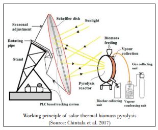 Over all, solar thermal pyrolysis open a new window to the researchers, scientific community, and in front of entrepreneurs for sustainable biofuel production. All the three products of pyrolysis i.e., bio-oil (liquid), biochar (solid) and pyrolytic (syngases) gas could be used efficiently in different sectors including transportation and industrial heating and power applications.