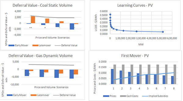 The first mover (Figure 2 – First Mover – PV) is locked-in with “expensive” supplies. As costs fall, the early movers’ assets are rendered obsolete by technological advances. This could result in one of two scenarios: a) Subsidies increase over time to close the growing gaps; or in its absence, b) losses spike because of under-recovery when payoffs prove insufficient to recover capital expenditures. Under these conditions, managers may decide to invest now or wait until PV costs have fallen farther.