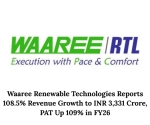 Waaree Renewable Technologies reported a 108.51 percent YoY rise in FY26 revenue to INR 3,331.42 crore, with PAT increasing 109.09 percent to INR 478.65 crore.