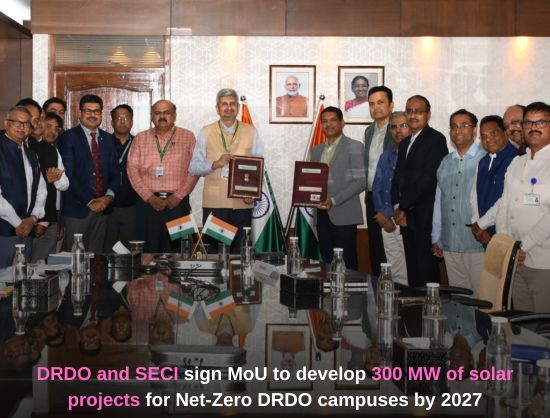 Defence Research and Development Organisation and Solar Energy Corporation of India have signed an MoU to develop 300 MW of solar-based renewable energy projects across DRDO campuses nationwide, aiming to establish self-reliant, Net-Zero campuses across all strategic DRDO locations by 2027.