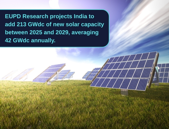 EUPD Research projects that India is expected to install about 213 GWdc of new solar capacity between 2025 and 2029 with annual additions averaging 42 GWdc. At the same time, module manufacturing capacity could exceed 280 GW by 2030, while cell capacity is projected to rise from 26 GW in 2025 to roughly 171 GW by the end of the decade.