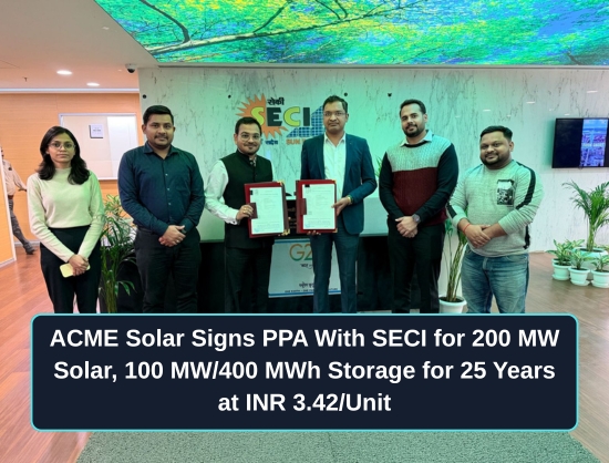 ACME Solar Holdings Ltd., through its subsidiary ACME Platinum Urja Pvt Ltd. has signed 25-year PPA with SECI for 200 MW solar with 100 MW/400 MWh battery storage at INR 3.42/unit, taking PPAs to 5.38 GW.
