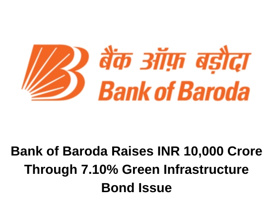 Bank of Baroda has raised INR 10,000 crore through the issuance of 7.10 percent seven-year green infrastructure bonds, fully subscribed via the National Stock Exchange of India EBP platform.