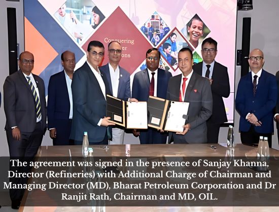 Bharat Petroleum Corporation and Oil India (OIL) have formalised a Joint Venture Agreement (JVA) to establish a Joint Venture Company (JVC). The agreement was signed in the presence of Sanjay Khanna, Director (Refineries) with Additional Charge of Chairman and Managing Director (MD), Bharat Petroleum Corporation and Dr Ranjit Rath, Chairman and MD, OIL.