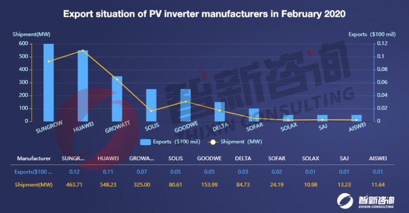 According to the latest data released by China Custom, PV inverter export shipments reached 2.4GW in February 2020 with a total export value of US$85 million. The shipments dropped 41% month-on-month (MoM), while showing an increase of 64% compared with February 2019.