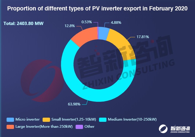 In terms of different types of inverters in the Chinese PV inverter export market in February, medium inverters accounted for 63.98%, small inverters accounted for 17.81%, large inverters accounted for 12.8%, and micro inverters accounted for 4.88%.