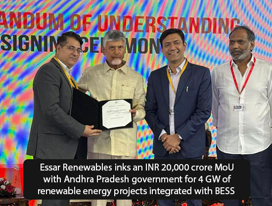 Essar Renewables has announced that the company has signed a memorandum of understanding (MoU) worth about INR 20,000 crore with the Government of Andhra Pradesh to develop 4 GW of renewable energy projects integrated with Battery Energy Storage Systems (BESS).