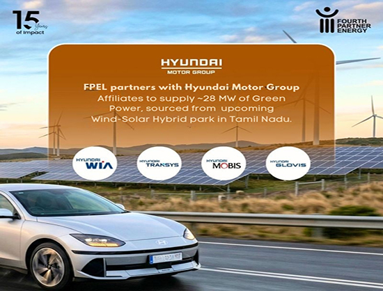 Fourth Partner Energy has signed an agreement to supply about 28 MW of wind-solar hybrid power to Hyundai Motor Group and its affiliates from its upcoming wind-solar hybrid park in Tamil Nadu.