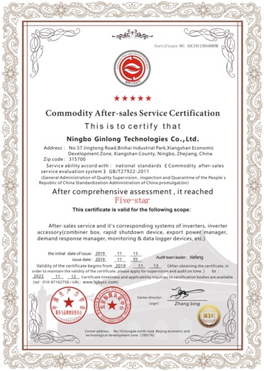 The comapny is proud to have been issued a five-star rating as part of its “Commodity After-Sales Service Certification" from the prestigious Beijing Standard Certification Center. Not only is this the highest possible level of service but Ginlong is also the first domestic renewable company to obtain this certification.
