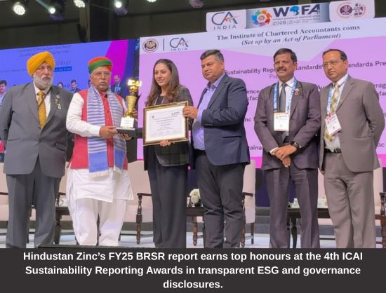 Hindustan Zinc bags the ‘Best BRSR Report – Manufacturing (Large Cap)’ award at ICAI Sustainability Reporting Awards, recognising its governance-led ESG disclosures and commitment to transparent, data-driven sustainability reporting.