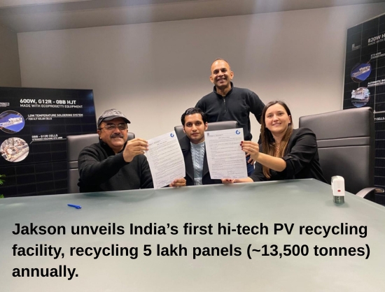 The solar recycling facility by Jakson will be capable to recycle ~5,00,000 solar panels, i.e., ~13,500 tonnes of modules annually, recovering critical materials and enabling responsible end-of-life solar management.
