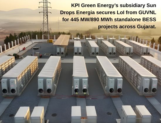 KPI Green Energy, a part of KP Group, has announced that its subsidiary Sun Drops Energia has received a Letter of Intent (LoI) from Gujarat Urja Vikas Nigam (GUVNL) for the development of self-owned IPP standalone Battery Energy Storage System (BESS) projects with an aggregate capacity of 445 MW/890 MWh to be set up at multiple locations in Gujarat.