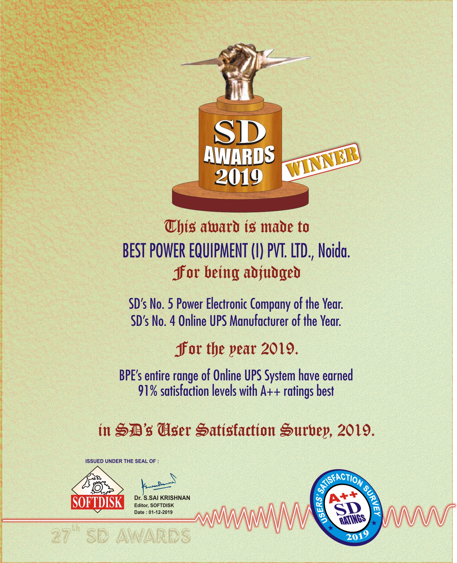 The Award was conferred by Soft Disk, a brand known for SD awards that organizes in-depth surveys of the power electronics industry every year. Soft Disk probed the satisfaction level, brand recall, speed of response to services required, pre-sales end-user education, costing, etc. through 15000 direct mailers and more than 500 personal interviews.(Source: softdiskindia.com, 27th SD award, VolumeXXVII-Issue-12, 1stdec2019 )