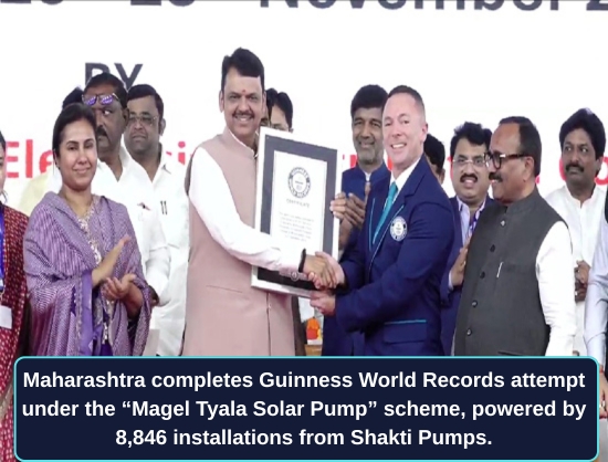 Maharashtra has completed its Guinness World Records attempt under the “Magel Tyala Solar Pump” initiative, achieving 45,911 solar water pump installations in just one month—one of the fastest and largest renewable irrigation rollouts globally. Shakti Pumps emerged as the leading contributor with 8,846 installations.