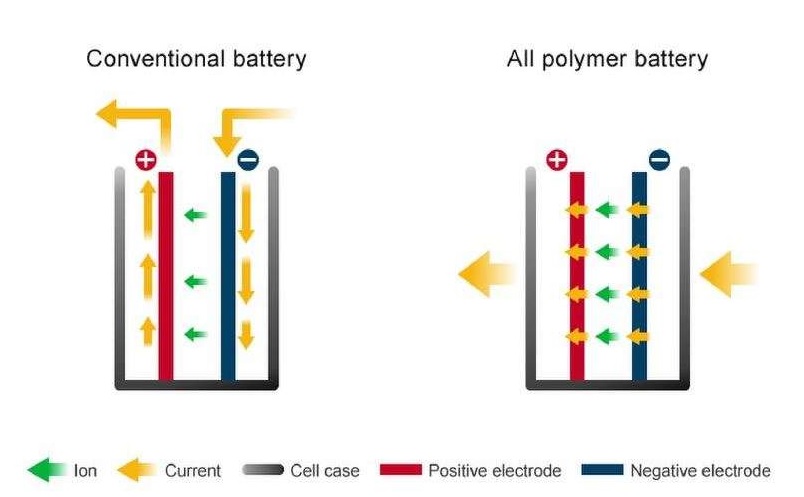 The all-polymer batteries with a bipolar structure, come equipped with polymers that replaces the liquid electrolyte and metal electrodes used in conventional batteries. Front and back of these battery cells are made of a polymer current collector. This technology not only enhances safety but simplifies the structure resulting in lower cost.