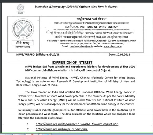NIWE invites Expression of Interest for "Development of 1000 MW Offshore Wind Farm in Gujarat" due at 05.00 P.M. on 25.05.2018 opening at 3.30 P.M. on 28.05.2018.