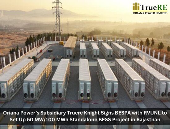 Oriana Power’s subsidiary Truere Knight has signed a Battery Energy Storage Purchase Agreement with Rajasthan Rajya Vidyut Utpadan Nigam Ltd. (RVUNL) to set up a 50 MW/100 MWh standalone BESS project in Rajasthan under the BOO model.