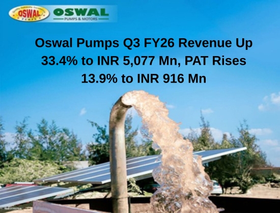 Oswal Pumps posted a 33.4 percent YoY rise in Q3 FY26 revenue to INR 5,077 million and a 13.9 percent increase in PAT to INR 916 million, driven by strong execution under the PM-KUSUM scheme.