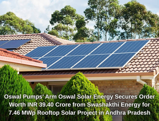 Oswal Pumps’s subsidiary, Oswal Solar Energy, has secured an INR 39.40 crore order from Swashakthi Energy to execute 7.46 MWp of rooftop solar projects under PM Surya Ghar Yojana in Andhra Pradesh.