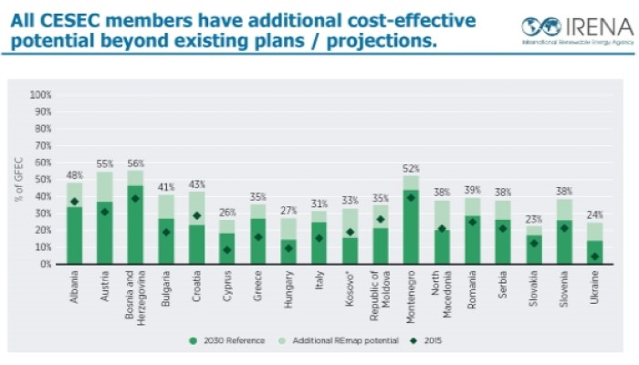 IRENA estimates that all CESEC members have cost-effective potential to accelerate the deployment of renewables over the next decade beyond current policies. By stepping up capacity, the share of renewables in the energy mix in CESEC members would reach 23 per cent to 56 per cent in 2030.