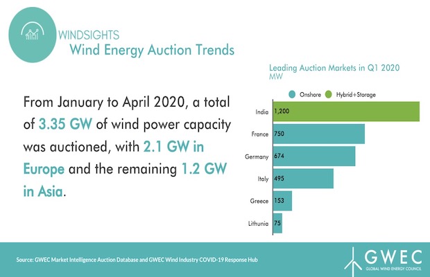 Wind Power Capacity Worth 3.35 GW Auctioned in Europe, 1.2 GW in India in Q1 2020: GWEC