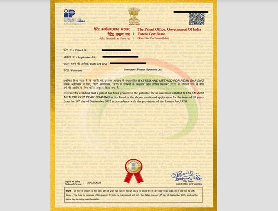 Servotech Renewable Power System Ltd. inform its valued customers, shareholders and stakeholders that the company has been granted a patent by the Indian Patent Office for its proprietary innovation titled 'System and Method for Peak Shaving'.