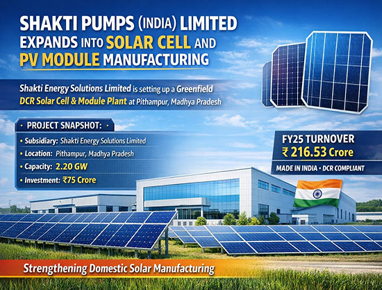 Shakti Pumps (India) Ltd. has infused an additional INR 75 crore into its subsidiary Shakti Energy Solutions to set up a 2.20 GW greenfield DCR solar cell and PV module manufacturing plant in Pithampur, Madhya Pradesh, taking the total investment to about INR 115.80 crore.