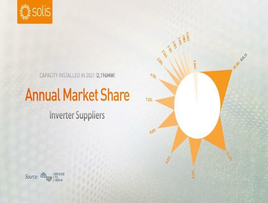A recent study conducted by the consulting and research services company BRIDGE to INDIA (BTI) has revealed that Solis is the No.1 inverter company for the year 2021. The evaluation has been done for the months from January to December, wherein Solis has emerged victorious with a 29.18% market share out of the entire share of 2196 MW capacity of inverters supplied in 2021. This was followed by Sungrow (17.47%) and Growatt (9.27%).