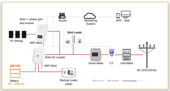 This solution is a better choice for users who have already installed photovoltaic systems. In addition to AC-coupled inverters and energy storage batteries, no additional equipment and costs are required. The installation circuit only needs to be simply modified in the original power distribution test. The storage capacity of the system depends on the capacity of the battery pack, which can provide power for key loads of about3kW without interruption when off-grid.
