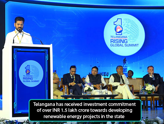 The Telangana government has signed multiple MoUs with companies to set up green energy projects worth over INR 1.50 lakh crore at the Telangana Rising Global Summit.