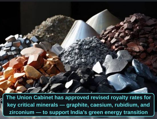 The Union Cabinet has approved new royalty rates for graphite, caesium, rubidium, and zirconium —key minerals for green energy, electric vehicle (EV) batteries and high-tech applications – to boost domestic production and facilitate the auction of critical mineral blocks.