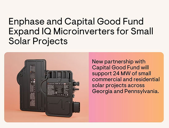 Enphase Energy has partnered with Capital Good Fund to support around 24 MW of small commercial and residential solar projects across Georgia and Pennsylvania in the US, using its microinverter technology.